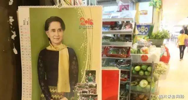 人们在商店门口悬挂昂山素季(Aung San Suu Kyi)日历