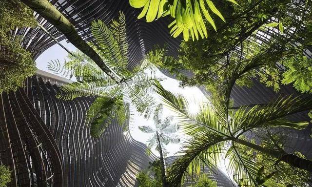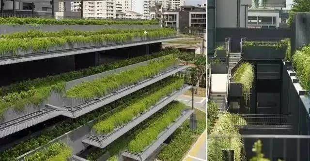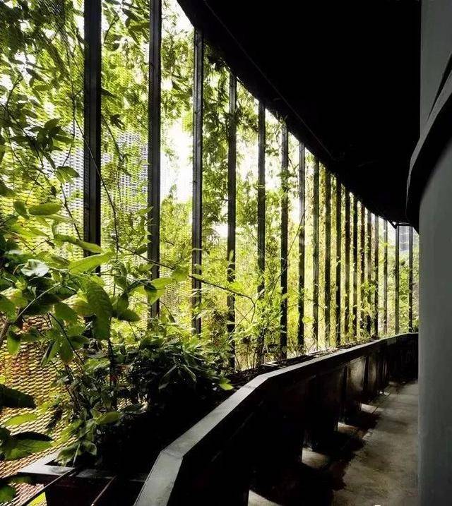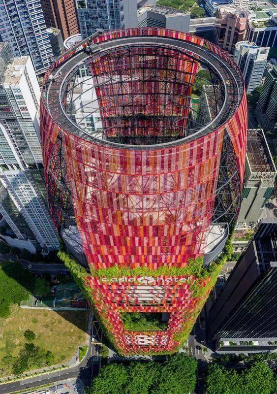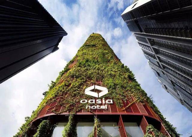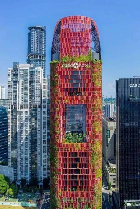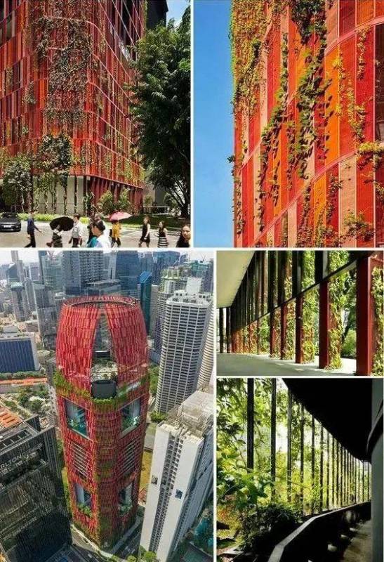 WOHA所设计的Oasia酒店耸立在新加坡高楼云集的中央商务区之中,而无论室内亦或室外空间,景观的用途被进一步扩展,成为了立面建筑材料中不可或缺的一部分。在鲜红的铝制金属网的映衬之下,21种攀缘植被的显得青翠欲滴,五彩缤纷的花果夹杂其中,为鸟类与昆虫提供了充沛的食物。