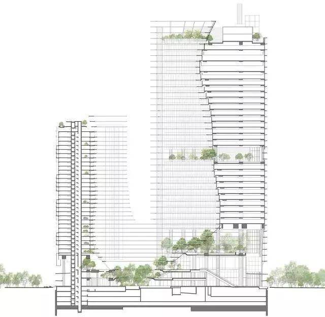 项目在有限的场地内,创造了丰富的空间体验,下层是开放广场,中层是医疗中心,上层是老人公寓和社区公园。这三个截然不同的楼层将各种建筑用途串联在一起,使土地利用最大化,形成一个垂直村庄,是应对新加坡人口老龄化设计探索的典型案例。