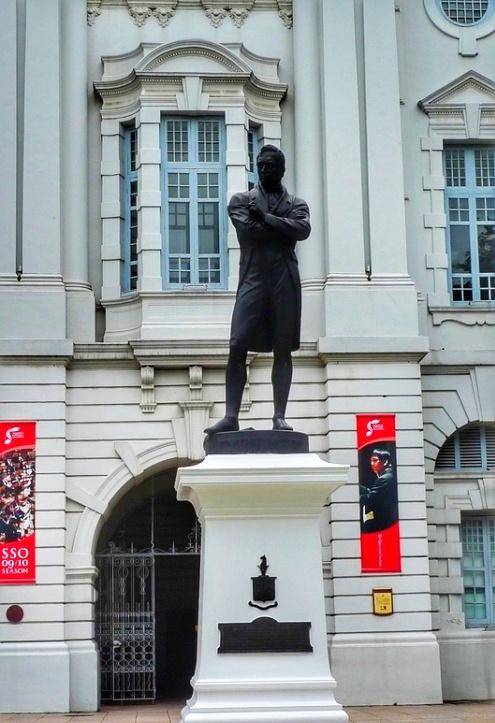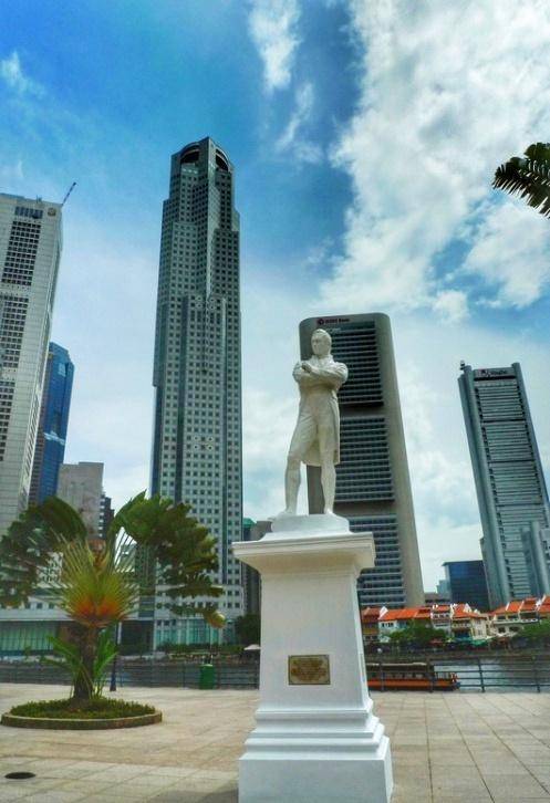 新加坡先属印尼室利佛逝王朝,后成为马来亚柔佛王国的一部分。1819年,英国人史丹福·莱佛士抵达这里,通过一些不太道德的手段与柔佛苏丹签约设立贸易站,并最终将这个小小渔村引向亚洲四小龙之一,自然而然的新加坡也就沦为了英国殖民地,并成为其在远东地区的转口贸易商埠和东南亚的主要军事基地。很多时候,手段的不道德和过程的不干净都不重要,结果往往超越一切成为主宰,这一点在政治上表现得尤为突出。史丹福·莱佛士最初出现在新加坡的形象是可恶的殖民者,但是,如今,他被新加坡人亲切地称作莱佛士爵士而立雕像于金融区最显眼的位置,而且还是一黑一白两尊。