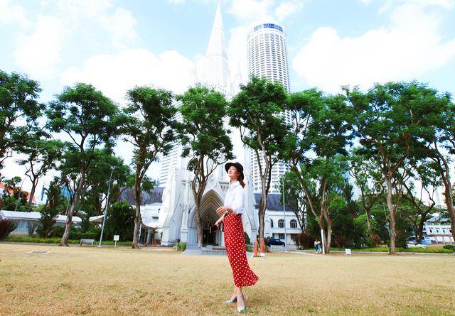 白衬衫和红色波点裙的搭配还蛮适合在洁白的教堂前拍照的,度假感一流。