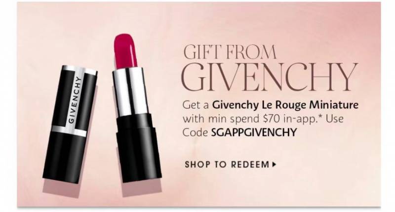凡在丝芙兰官方app上购物超过$70,结算时输入SGAPPGIVENCHY折扣码,就可获赠一只迷你纪梵希口红~