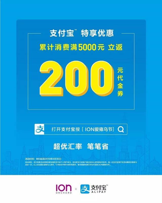 在乌节路最高端的ION商城购物,支付宝累计消费5000人民币,就可以立刻获得200人民币的代金券!
