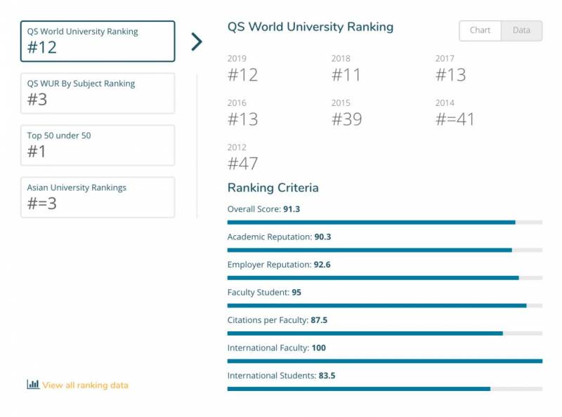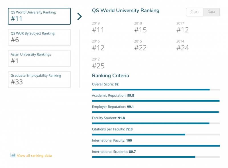 事实上,NUS近些年的综合世界排名都相对稳定,在第11位-15位左右徘徊。虽然综合排名没能跻身全球前10,但在亚洲高校这个“小班”里,NUS一直都名列前茅,多次获得亚洲第一的殊荣。优异的排名吸引了世界大批优秀的申请者,入学难度不言而喻。