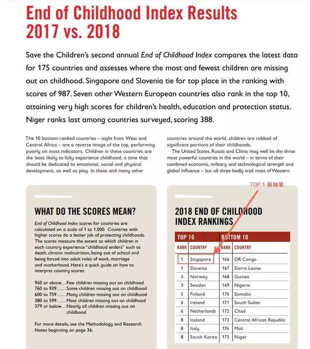 据非政府组织“拯救儿童”(Save the Children)发布的最新的年度《儿童终结报告》(End of Childhood report)数据显示,175个国家中,新加坡最适合孩子成长!(新加坡与斯洛文尼亚并列第一,1000分的总分新加坡获得了987分!)