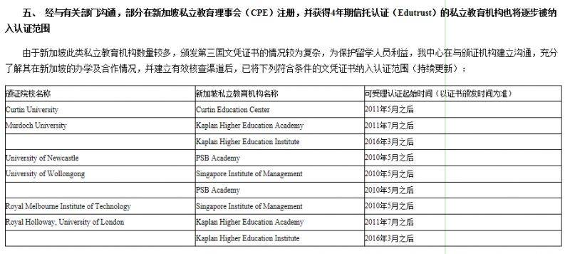 2018年5月16日,中国教育部留学服务中心-中国留学网发文公布:2010年5月之后在新加坡PSB学院毕业获得的University of Wollongong、University of Newcastle文凭可以回国做认证。