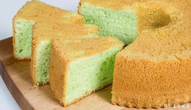 蛋糕的绿色来自于斑兰叶——一种东南亚常用香料。它的全称是斑兰戚风蛋糕(Pandan Chiffon Cake),口感绵密,清新香甜,尝了一口就停不下来~