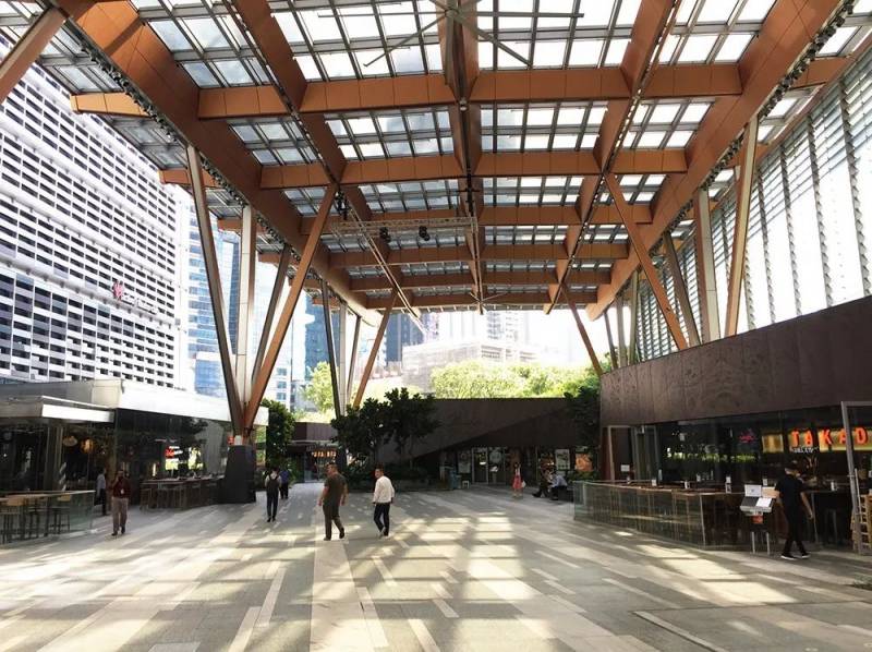我们在新加坡即使突遇暴雨,也能在雨中步行几百米,毫发未湿,因为大多数商业空间都有设置有长长的连廊或是顶棚
