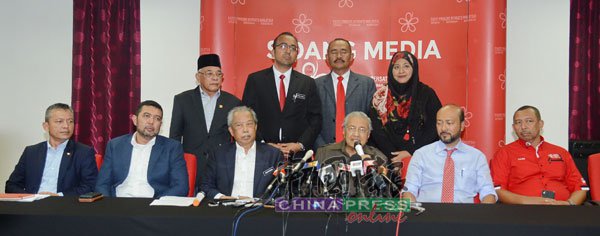马哈迪(前排右3)在记者会上,逐一回答媒体的提问。右2起是慕克里兹、慕尤丁及马祖基。