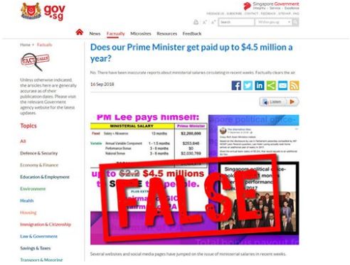 广告有关新加坡总理年薪超过400万新元的假新闻在网上流传,政府打假网站澄清,总理的年薪是220万新元
