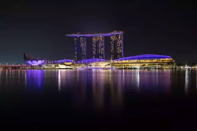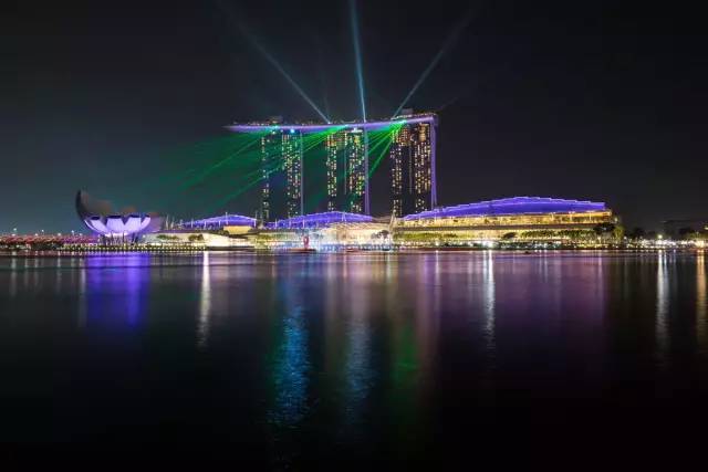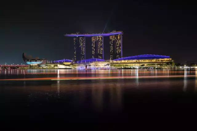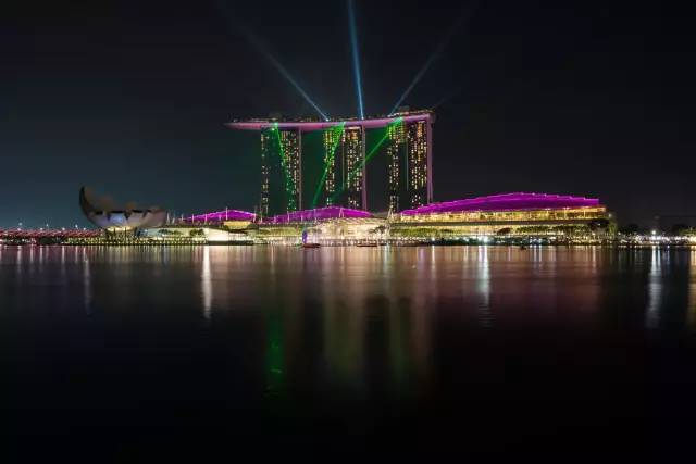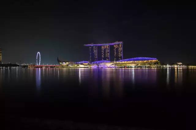 除了在高处看新加坡夜景,沿着新加坡河也能拍到不错的城市夜景。比如在鱼尾狮公园这一侧沿河区域,就能拍到远处的金沙酒店夜景。在这里拍金沙酒店晚上9点(9:00-9:15)的灯光秀也很不错。