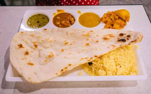 新加坡有很多印度人,因此也有很多印度餐厅。上次来新加坡没吃到印度菜,这次就找机会吃了,同样是在金沙购物中心地下一层大食代里吃的印度菜。我点了素食套餐,包含米饭+烤饼+4份咖喱菜,合计9.9新元。其中烤饼是现场烤制的,先和面,做出薄饼,再放进炉子里烤。然后四份咖喱里包含内容不同。有时候大家称印度菜是咖喱糊糊,还真有点贴切。我能看出来的大概有蔬菜、豆子、土豆,还有一种看不出来。咖喱整体味道是偏辣的。我看到旁边印度人是把烤饼撕碎,蘸着咖喱吃,我也效仿了。我想说新鲜烤制的饼还不错,咖喱微辣的口感,也挺下饭的,我竟然吃得有点停不下来的感觉。同样,咖喱偏辣,不能吃辣的人不建议尝试。