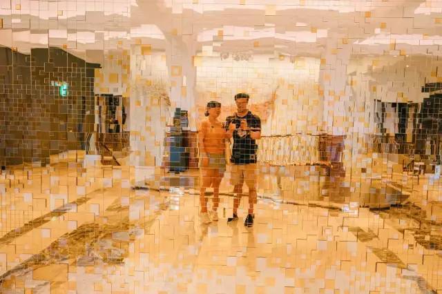 在售票处对面的公共区域,有个公开展,游客可以走到透明玻璃上,观赏装置艺术。本来看玻璃下面黑乎乎的,物品延伸到很深的地方,有种无限延伸的感觉,等我们踩到玻璃上,仔细观察,就会发现这是对称和倒影设置,不然还以为是“万丈深渊”呢。