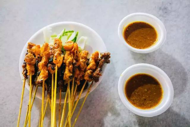 沙爹是马来西亚传统美食,就是把腌制好的鸡肉、牛羊肉、虾等串串,放在炭火上烤,再刷上一层厚厚的沙爹酱。沙爹酱是用花生酱、椰浆、幼虾混合的,带点甜味。