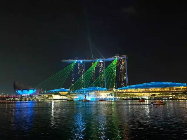 一侧夜景是新加坡城市,能看到近处的金沙购物中心、LV店、远处的富丽敦酒店、大榴梿、鱼尾狮等。金沙酒店每晚9:00到9:15有灯光秀表演,不管是从河对面看还是在金沙购物中心前面看表演,效果都很棒。