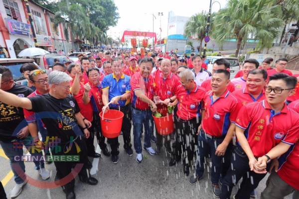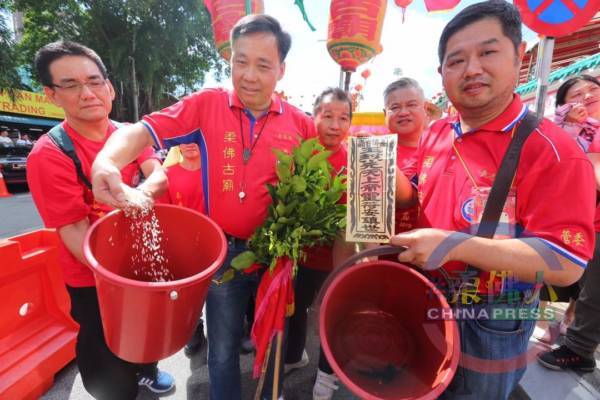 今早上午11时的吉时一到,新山中华公会会长拿督斯里郑金财率先以石榴枝和柚子叶沾圣水,泼洒在街道上,同时高呼“兴啊!发啊!”清洗游神路线,训令妖魔鬼怪回避。