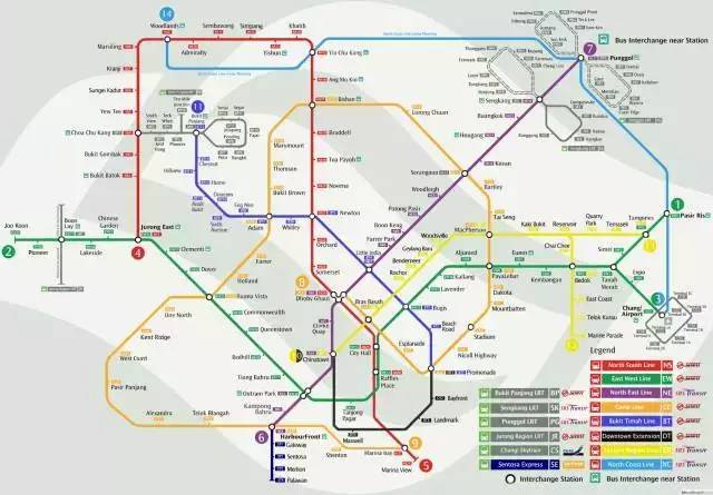 新加坡地铁叫MRT,几乎覆蓋整个坡城,和上海一样用不同的颜色区分不同路线,每个地点有数字编号。