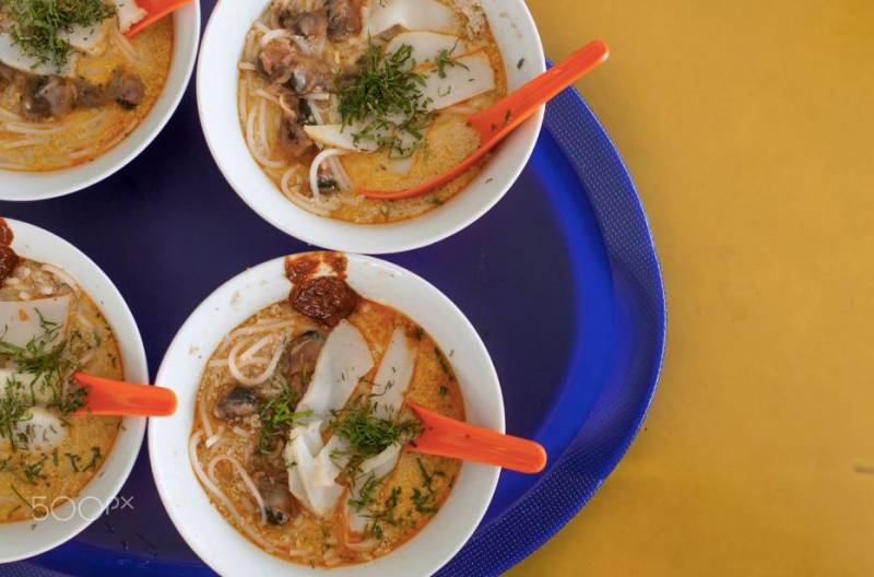 具代表性的娘惹美食,在咖喱汤汁中混合椰浆、辣椒、虾米、蛤肉、鱼饼以及油豆腐等食材,调制成汤头,加入细白的粗米粉,就是一碗令人喷火的呛辣料理。
