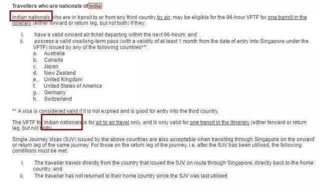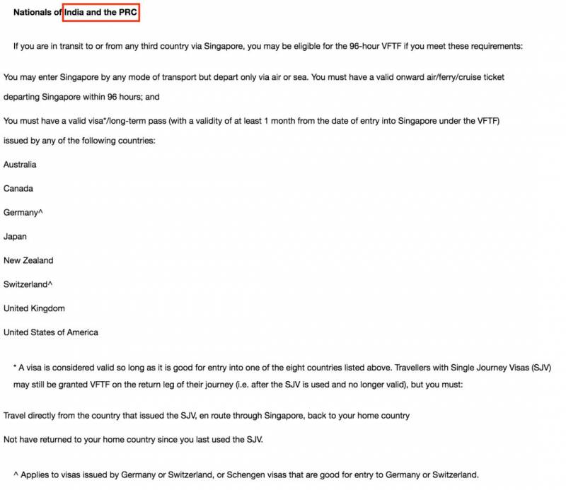 2016年年底之前,在持有效机票满足8个国家的有效签证的前提下,中国和印度都能享受到的96 小时免签证转机服务。然而到了2016年年底,新加坡移民局官方网站只显示印度可以,没有中国。