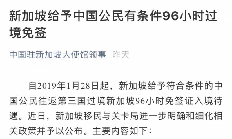 然而在昨天(2019年2月21日),“中国驻新加坡大使馆领事”微信平台发布了这样一篇文章《新加坡给予中国公民有条件96小时过境免签》。