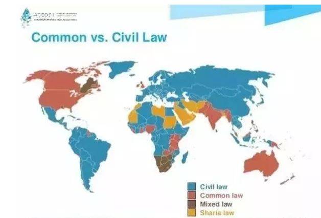 总体上来说,新加坡执行的是CommonLaw(英美法),和图中其他一些棕色的国家类似,比如英国,美国,加拿大,澳大利亚等。世界上也有很多国家(如上图中蓝色的那些,包括中国)执行的是CivilLaw,即大陆法。