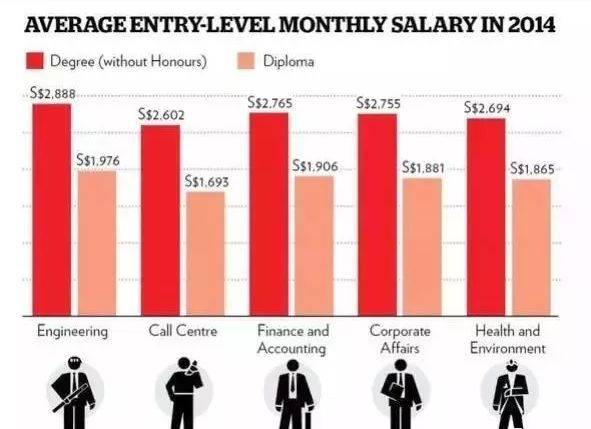 说说刚从学校毕业的学生的起薪。从上图中你可以看到,如果拥有大学本科学历,那么起薪一般在每个月2700-2800新币左右(约合人民币13000左右)。如果是大专学历,那么起薪在1800-2000新币左右。有一些特殊专业(法律和医科)的起薪会特别高,因为这两个专业在新加坡非常吃香,供不应求。
