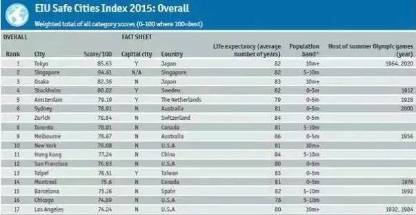 据经济学家杂志(Economist)在2015年的一项研究得出的世界最安全城市排名中,新加坡位列第二,仅次于东京。