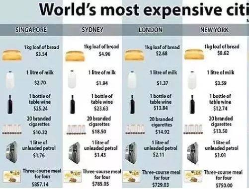 2015年,新加坡被经济学家杂志评为世界上生活成本最贵的城市。在上图中你可以看到,新加坡的面包和牛奶价格比伦敦还要贵,烟酒被政府课以重税,汽油价格比纽约更贵,而去饭店就餐的价格全世界最高。