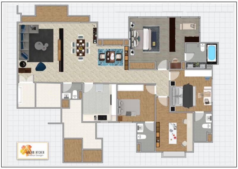 设计公司设计师与客户沟通,简要勾勒初步装修设计方案,如有必要展示过往的设计图供客户参考。绘制平面图3D和平面版本。(一张设计图,绝对看得出设计师的功底。)