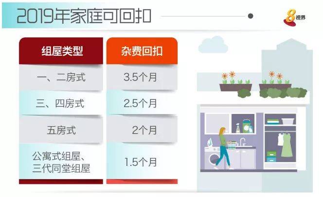 杂费回扣:符合条件的约93万组屋住户,将获得1.5至3.5个月的杂费回扣,共发出1.3亿新币