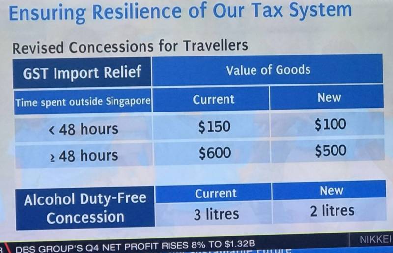 出国旅行少于48小时的消费税免税额将从150新币减至100新币;出国48小时或以上则从600新币减至500新币,明天起生效。