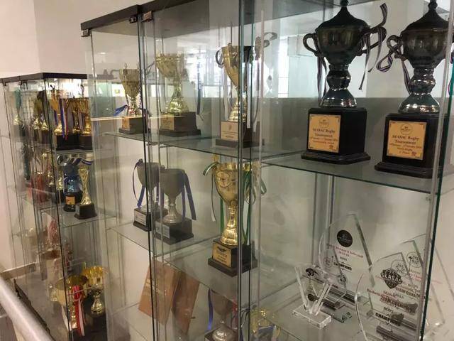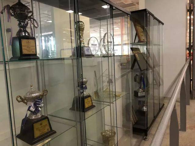 体育馆入口有一片柜子,满满的各种体育奖杯