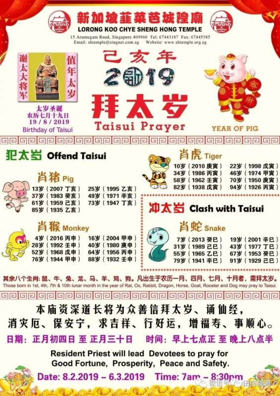 还有韭菜芭城隍庙拜太岁的,太岁即岁神,又称太岁星君,传统民俗相信,一个人如果“犯太岁”,在那一年里就会百事不顺,事业多困厄,身体多病变,因此要安奉太岁星君,以保“本年平安无事,万事如意,福运亨通。”每到过年时期,新加坡的韭菜芭城隍庙便挤满了“拜太岁”的人群。