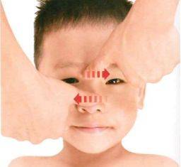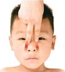 3.扳鼻梁: 一手拇指至于一侧鼻翼,另一手拇指至于侧鼻根部;两拇指同时用力像对侧推挤,扳动鼻梁约20次。