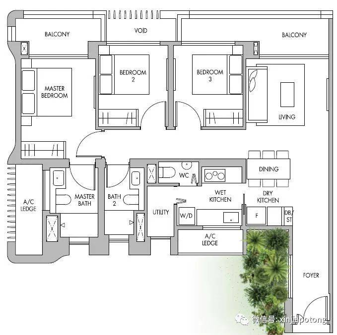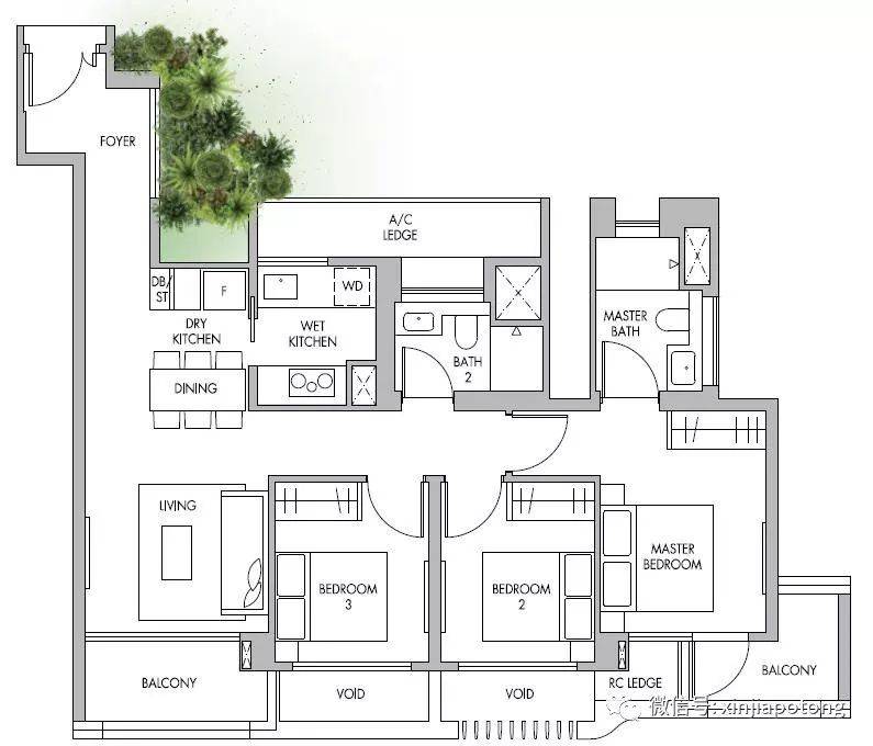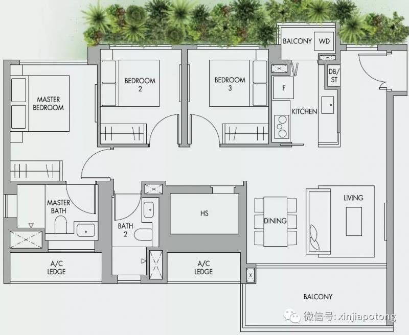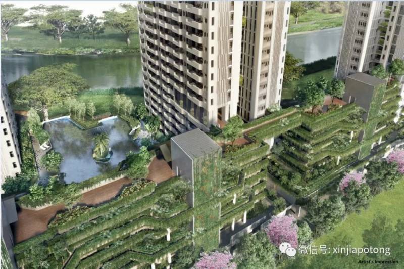 三室一厅豪华型,面积为102平方米,带保姆房,大阳台,河景和游泳池朝向,价格165.6万新币起