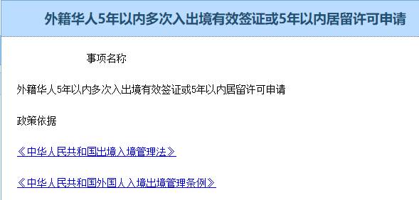 对来华探望亲属、洽谈商务、开展科教文卫交流活动及处理私人事务的外籍华人,公安机关出入境管理机构可按规定签发5年以内多次入境有效签证;对在当地工作、学习、探亲以及从事私人事务需长期居留的外籍华人,可按规定签发有效期5年以内的居留许可。