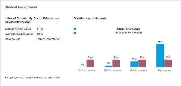 很快,乐妈就被一个ICSEA (翻译过来叫社区社会教育优势指数)指数吸引了。比如这个柱形图显示了这所学校North Sydney Boys high school(这是一个历史悠久的公立男校,是academic selective)的家庭的经济水平分布,数据显示这个学校75%家庭收入是属于澳洲的前25%。 Rachael跟乐妈解释说这个数据图是根据家长们的税单制定的,目的是给政府在给各个学校拨款参考用,如果学校低收入家庭多,拨款就会多。)