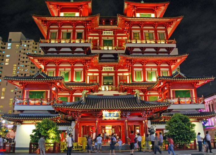 新加坡佛牙寺龙华院位于牛车水地区,是一个佛教庙宇博物馆,2002年由释法照创设,寺中供奉了释迦牟尼的遗牙,故而以佛牙寺命名。由于是新近修建的寺院,佛牙寺建筑风格磅礴大气,寺内金碧辉煌,每层还设有不同主题的博物馆,内藏各类古董文玩,佛教用品,是牛车水地区最大的佛教寺庙,也是游客参观的好去处。