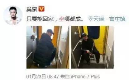 (吴京没买到票,搬了张小板凳坐在车厢连接处)