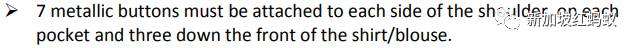 七个银色纽扣需分别佩戴在肩膀皮瓣上(两个)、胸前口袋上(两个)、与上衣的前三个纽扣上。