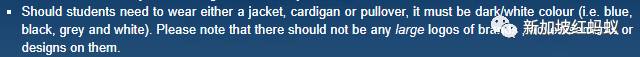 若学生需要穿上外套,只能穿白色或暗色的(例:蓝、黑、灰、白)。外套上不能有任何大的徽标、或设计。