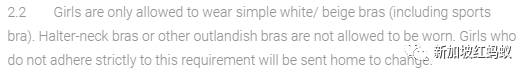 女生只能穿白色或肉色的内衣(包括运动型内衣),不许穿高领或其他奇异的内衣。不遵守此规定的女生,会被要求回家更换。