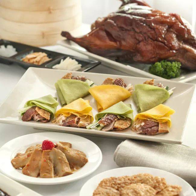 招牌菜品为辅以 8 道不同佐料的地道的北京烤鸭