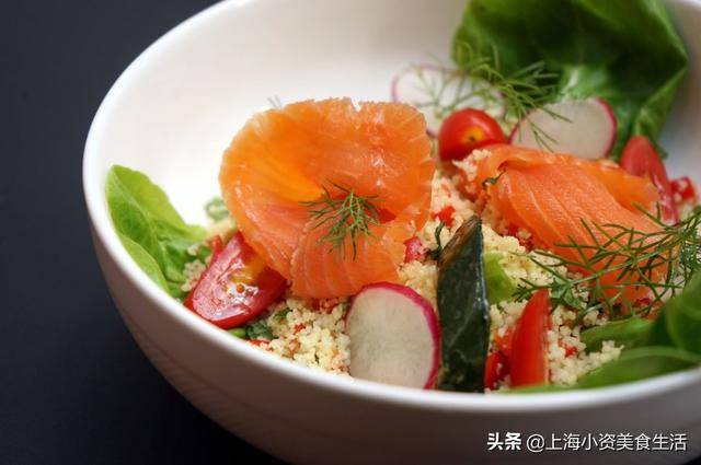 沙拉是小资君每次必点的,这道烟熏三文鱼库斯库斯沙拉三文鱼口感新鲜爽滑,萝卜清脆爽口,小番茄软而多汁,葡萄乾清甜可口,吃在嘴里还能嚼到颗粒感,酸酸甜甜,很是清爽。