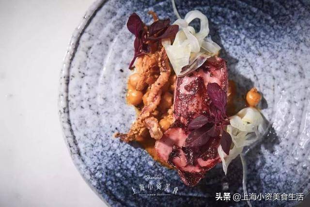 小鱿鱼甜脆爽口,也给好评!鱼身部分用橄榄油煎制,触须部分油炸,超级香酥。配菜用的是他们家自制的西班牙风味腊肠炖煮的鹰嘴豆,再加上腌制茴香头解腻,一口一口,完全停不下来!