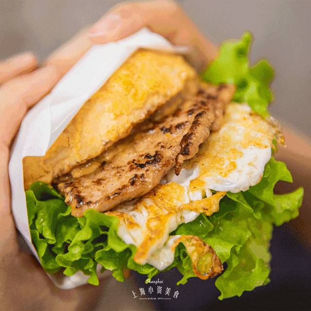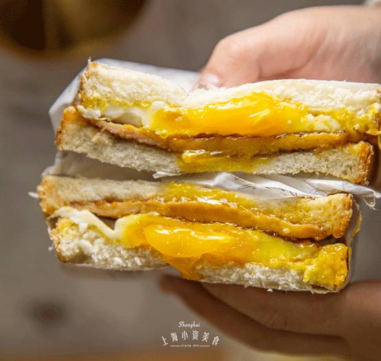 两片土司表面煎至软酥,涂上沙拉酱,中间夹入一颗荷包蛋和一片猪肉排,荷包蛋控制在7分熟,咬下去一定要小心流浆蛋黄会溅出来。