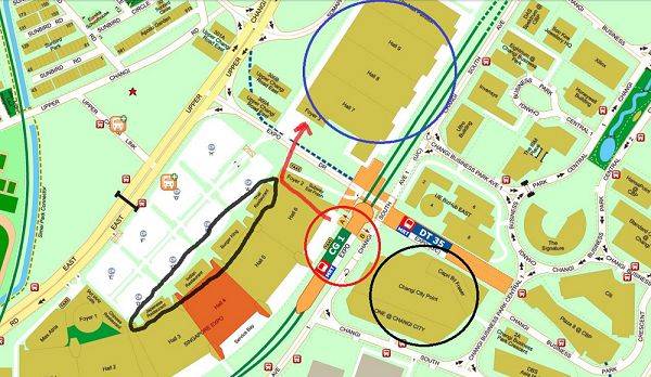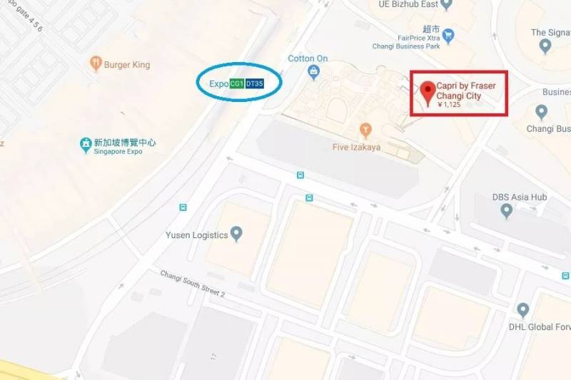 红色圆圈代表的就是博览中心地铁站(Expo MRT Station CG1),也就是考场那一站;