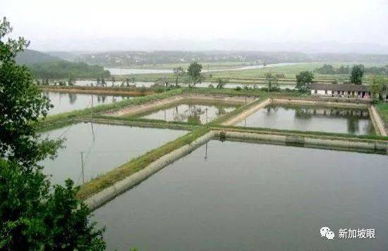 鱼生源自广东珠江三角洲的江门,当地有许多像这样养著鲩鱼的鱼塘: