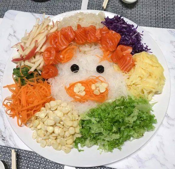 例如将鱼生拼凑出可爱的生肖动物: