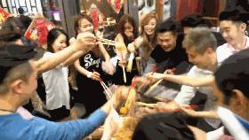围满一桌的大伙儿起身,用筷子一边将鱼料捞起来,一边大喊:“捞啊!发啊!”